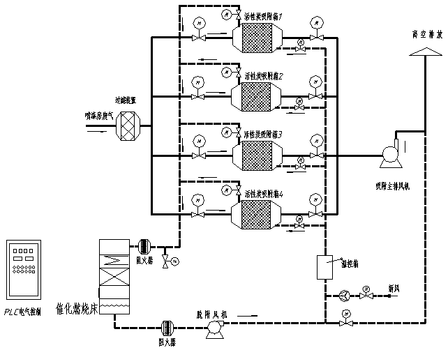 - 系統由4個活性炭吸附箱(3用1備),1個催化燃燒床構成,將各條生產線中的所有排氣管合并連接引至凈化設備,各個支管上安裝一只手動調節閥,配比例調節;廢氣經收集匯總后送入集氣箱,再將廢氣送入干式過濾器,干式過濾器能更為精細的祛除廢氣中的粉塵和漆霧,從而避免活性炭微孔被堵塞,延長活性炭的使用周期,活性炭吸附器接近飽和時,系統將自動切換到備用活性炭吸附箱(此時飽和活性炭吸附箱停止吸附操作),然后用熱氣流對飽和活性炭吸附箱進行解吸脫附,將有機物從活性炭上脫附下來。在脫附過程中,有機廢氣已被濃縮,濃度后的濃度較原濃度提高幾十倍,達2000mg/m3以上,濃縮廢氣送到催化燃燒裝置,最后被分解成CO2與H2O排出。完成解吸脫附后,活性炭吸附器進入待用狀態,待其他活性炭吸附箱接近飽和時,系統再自動切換回來,同時對飽和活性炭吸附器進行解吸脫附,如此循環工作。最后凈化后的潔凈氣體由主排風機排入大氣中。