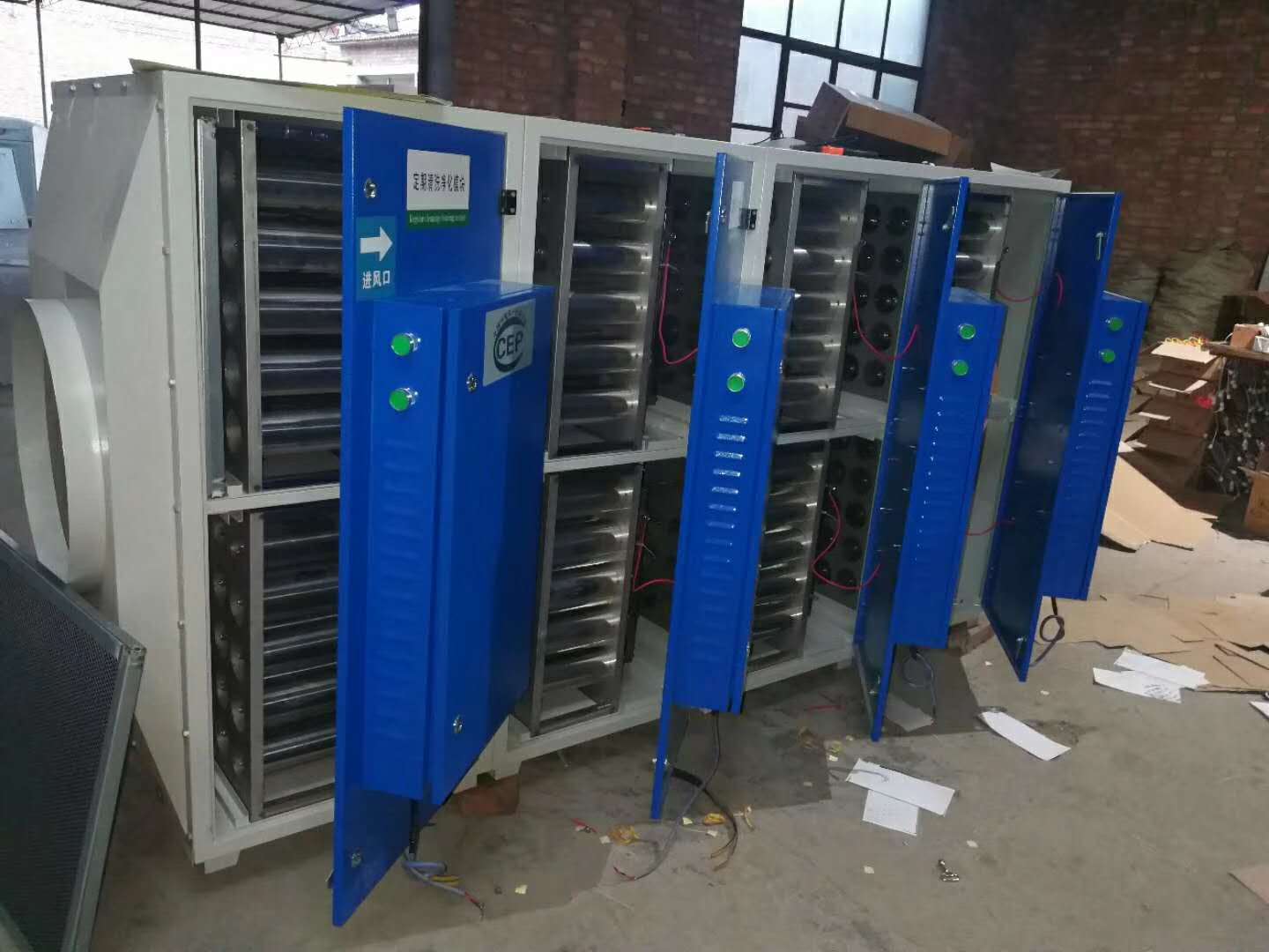 低溫等離子反應器由大功率電源(高頻率、高電壓)、放電電極、絕緣體(介質)構成,核心部件采用石英、不銹鋼等耐腐蝕材料制造,待處理氣體流經反應器被電離成為等離子體,在極短的時間里(0.01--0.1秒)完成物質的裂解過程,其處理能力之強,能效比之高是前所未有的。